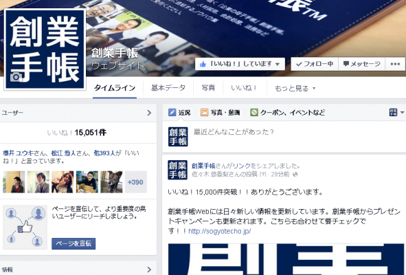 創業手帳のfacebookファン数が15000人突破。開設わずか5ヶ月