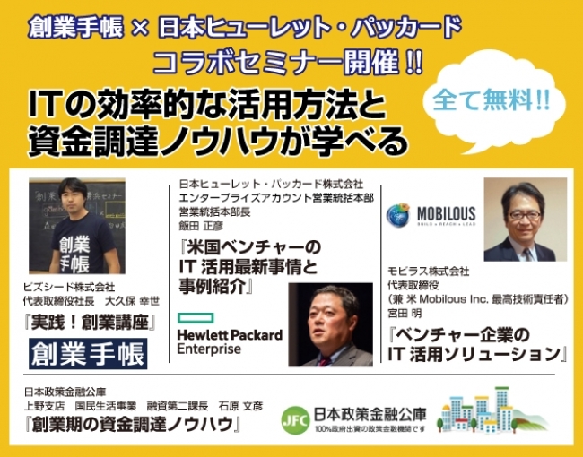 『創業手帳』を発行するビズシード株式会社は日本ヒューレット・パッカード株式会社と合同主催で、起業家向け無料セミナーを2016年1月26日に東京都中央区京橋にて開催します。起業後のビジネス拡大に重要となるITの活用方法について専門家が登壇します。また、日本政策金融公庫が後援となり、資金調達の最前線についてお伝えします。