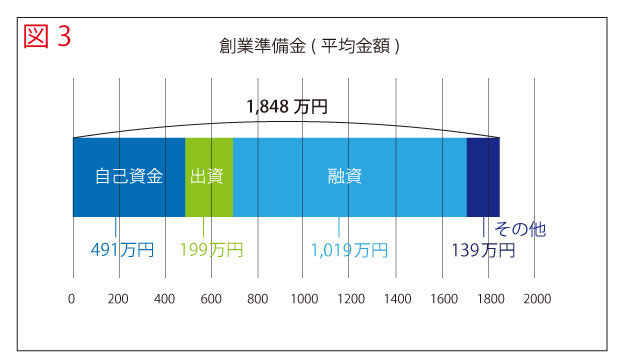 ・創業資金の平均内訳は自己資金491万円、出資199万円、融資1,019万円、その他139万円