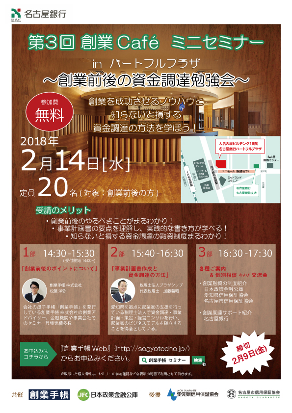 「第3回 創業 Café ミニセミナー」は名古屋銀行と、日本政策金融公庫、創業手帳が共催。愛知県信用保証協会 名古屋市信用保証協会が協力の元、開催。