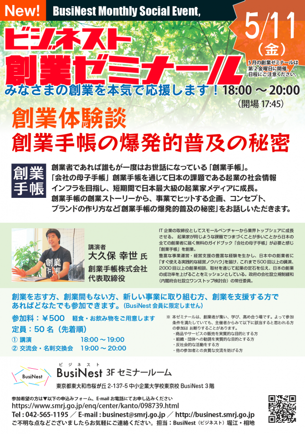 5/11開催「ビジネスト創業ゼミナール」に創業手帳 代表の大久保が登壇