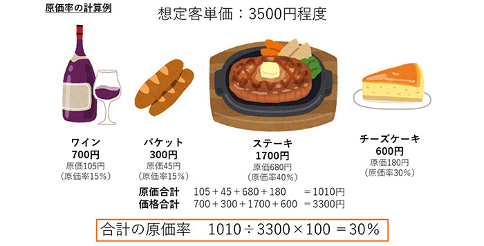 一般的な飲食店の原価率の平均は30%程度と言われています。これは、メニュー単体の話ではなく、一人あたりの想定客単価を考えた時に、平均で30%前後に収めることが望ましいという目安です。