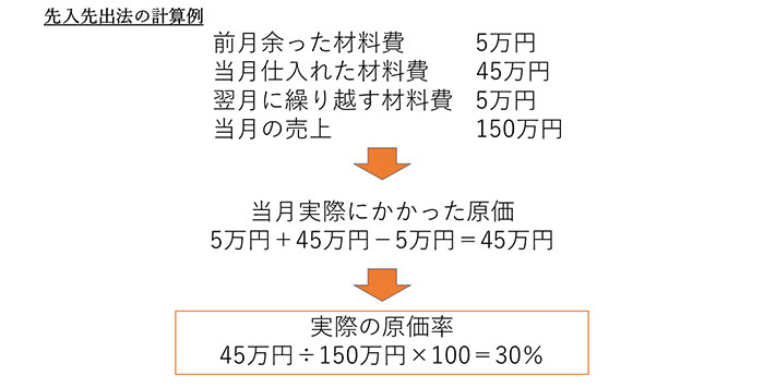 前月から持ち越した原価と、翌月に持ち越す原価を考慮して原価を計算する「先入先出法」を使うと、より正確に原価率を計算することができます。
