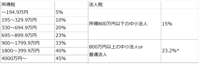 個人事業主は、そのままでは収益全体に所得税が適用されます。所得税は法人税よりも累進性が強いため、最高で45%という高額な税率が課せられます。一方で、法人化した場合には年間所得が800万円を超えた場合にも税率は23.2%(今後法人化した場合)で済みます。