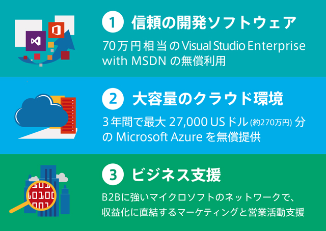 アイディアを持ちながらも具現化したりビジネスに繋げる手法を持たないスタートアップを対象に、マイクロソフト社製の最新の開発者向けソフトウェアと、最大$27,000(約270万円)のクラウド環境「Microsoft Azure」の提供や、収益化へと繋げるビジネス支援を3年間無償で受けられるプログラムです。