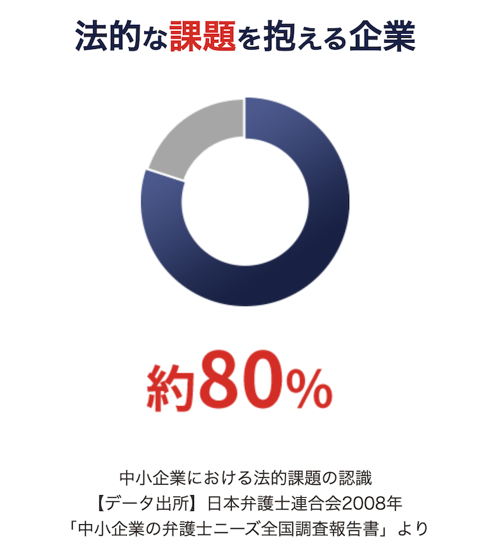 日本弁護士連合会の調査によると、中小企業の約8割が法的トラブルを抱えていることがわかっています。つまり、普通にビジネスを展開していくなかで、法的トラブルは日常茶飯事だということです。8割もの企業がトラブルを抱えているのだとすれば、法的トラブルを「あらかじめ起きること」として想定して動くほうが賢明ではないでしょうか。