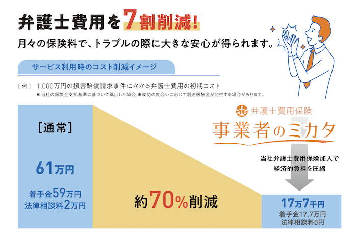 「事業者のミカタ」を利用すれば、弁護士費用は基本的に7割程度まで削減可能です。