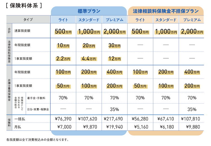 支払われる保険金額は、それぞれのプランの保険料に対して非常に充実しています。年間に支払われる保険金額は上限400万円まで引き上げることができます。一番安いプランでも年間で100万円まで保険金額が支払われます。これだけの保険金額が支払われれば、急な弁護士費用の出費で資金繰りに焦る心配もなくなります。