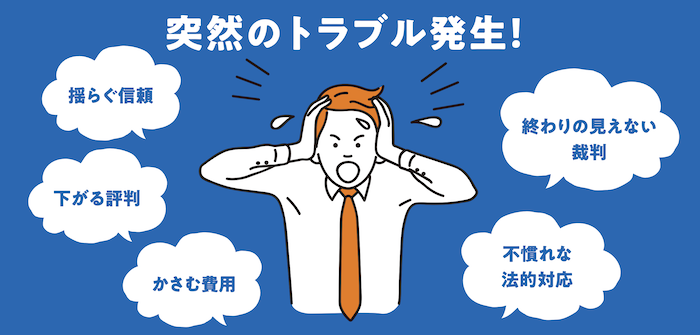 このように、インターネット上でのトラブル発生のタネは無数にあり、常に法的トラブルと隣り合わせです。いざトラブルが起きたときに備えがないと、取り返しがつかなくなることになりかねません。
