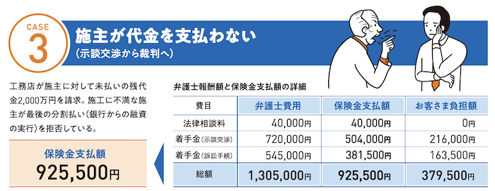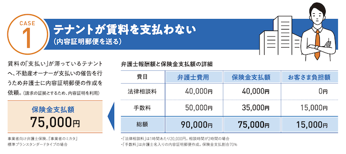 この事例では、賃料未払いのテナント企業に対して支払いの催促を行うため、弁護士に内容証明郵便を作成してもらうことになりました。弁護士費用として本来であれば9万円の費用が必要でしたが、「事業者のミカタ」を利用していることによって保険金が7万5,000円支払われ、最終的な費用負担は1万5,000円のみで済みました。