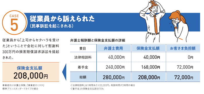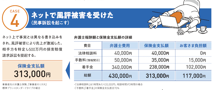 このケースでも、インターネット上で事実とは異なる口コミを書き込まれたことによって、売り上げが激減してしまいました。企業側は口コミを投稿したユーザーを特定し、500万円の損害賠償請求訴訟を提起。本来であれば43万円必要であった弁護士費用は、「事業者のミカタ」によって支払われた保険金31万3,000円を補填することで、最終的に11万7,000円のみで済みました。