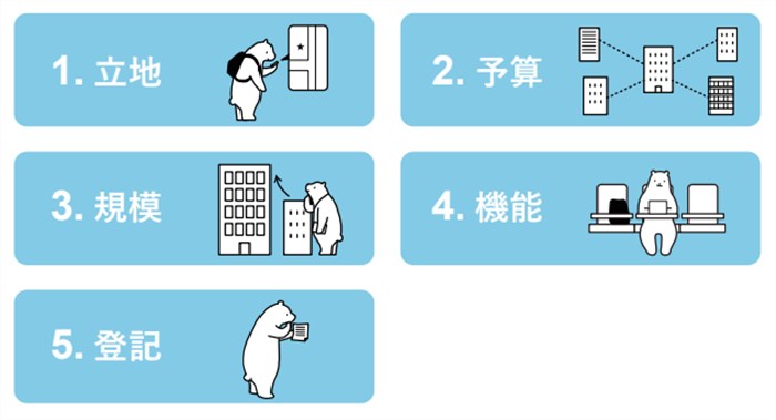 創業期のオフィス選びにおいては、次の5つのポイントに留意しましょう。