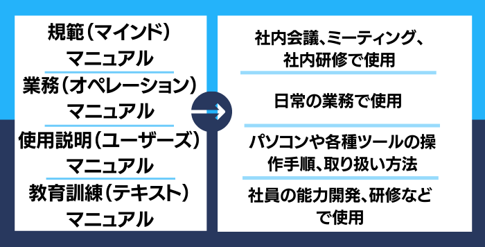 先ほどオペレーションマニュアルという言葉が出てきたところで、マニュアルの種類を考えてみましょう。マニュアルは大きく4つに分類することができます。
