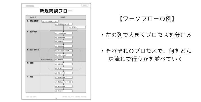 中山:ワークフローとは、業務全体の流れを表すものです。動き方、考え方を可視化し、業務の全体を俯瞰して見られるようにしましょう。これを見れば、今どの段階にいるか、次に何をすればいいのかが、すぐに分かるようにします。