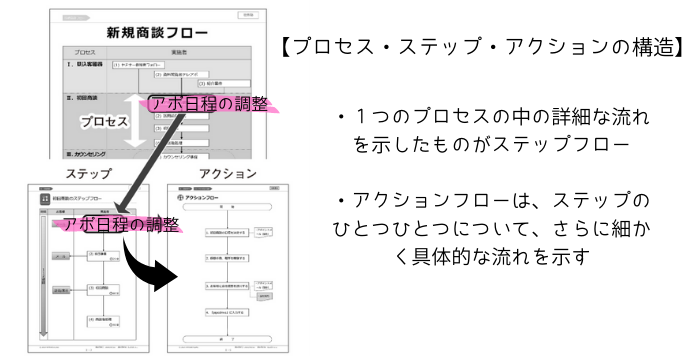 中山:次に、それぞれのプロセスごとに「ステップ」と「アクション」を作っていきます。プロセスを大見出しとするなら、ステップは小見出し、アクションは本文となります。つまり、業務内容を階層化していくわけです。