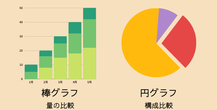 量の比較なら棒グラフを選ぶと分かりやすいですし、要因の構成を比較したいのであれば円グラフが適しています。