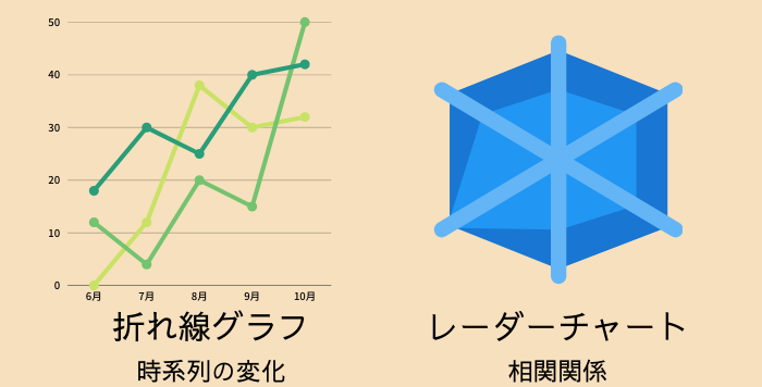 折れ線グラフは時系列である数値の移り変わり見たいときに適していますし、レーダーチャートはさまざまな要素に分解して考えたときに、どの要素でのポイントや数が多いかを視覚的に見ることができます。
