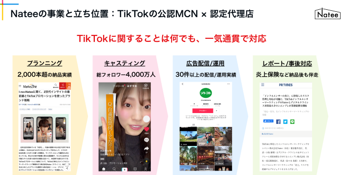 「TikTok」でマーケティング事業を展開しているのがNateeです。時代の流れを象徴するプラットフォーム「TikTok」で、クリエイターと広告コンテンツを製作しています。