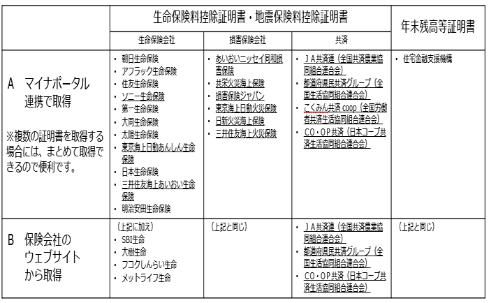 保険料控除証明書等をデータで取得できる保険会社には、「マイナポータル連携で取得」と「保険会社のWebサイトから取得」の2つのパターンがあります。