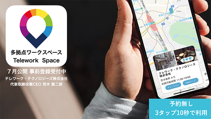 予約不要の3タップ10秒で利用できる多拠点ワークスペース・アプリ「TeleworkSpace(テレワークスペース)」を開発しています。