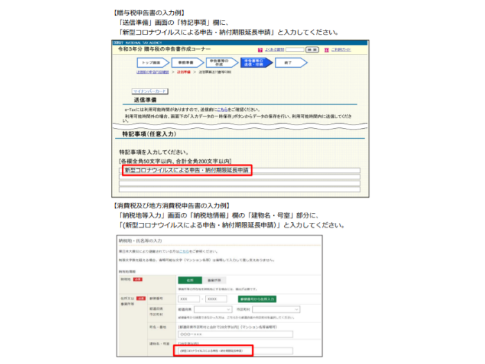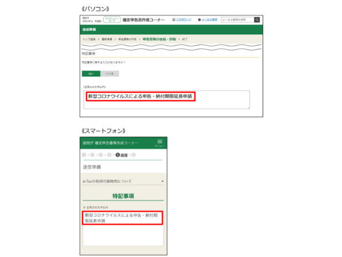 e-Taxでの申請時は、所定の欄(特記事項)に同様の文言を入力することで延長が可能となります。