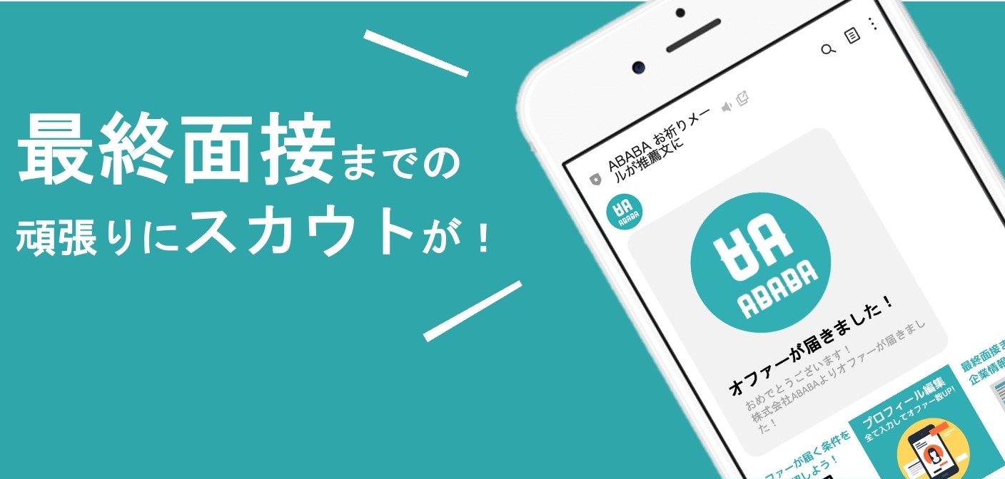 就活生にとって、これまで評価されることのなかった就職活動の過程が評価されることです。最終面接まで頑張って辿り着いても、そこで落ちてしまえばおしまいで、また1からやり直さないといけないのが就職活動の現状でした。ABABAでは最終目節まで頑張った実績を評価した企業からスカウトが届きます。
