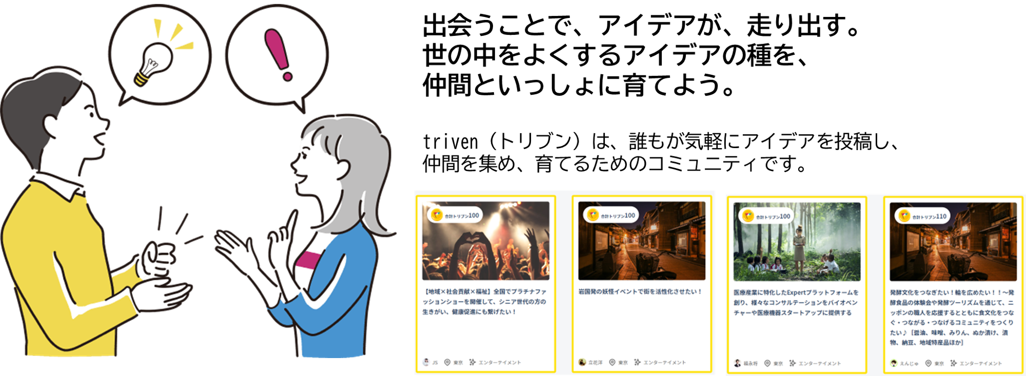 | 事業内容 | Webサービス「triven(トリブン)」運営、新事業開発支援、共創プロダクト製造販売 |