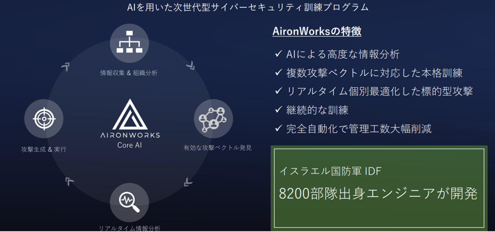 AironWorks株式会社の、サイバー攻撃に対して防御力を高める訓練プラットフォームの特徴は、イスラエル国防軍でサイバー攻撃・防御を任務とする超精鋭部隊Unit 8200出身の開発者が中心となり、本物さながらの実践的なサイバーセキュリティ訓練をクライアント企業に提供する、という点です。