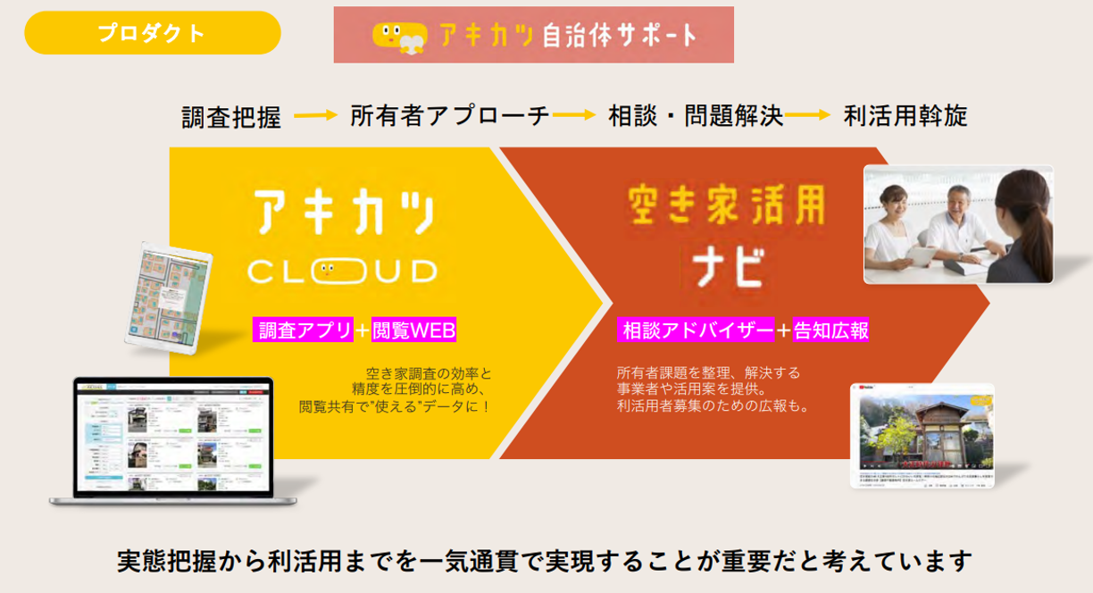 具体的には以下の製品とサービスを以て、『空き家対策』に関する”実態把握”から”利活用促進”までをサポートしています。