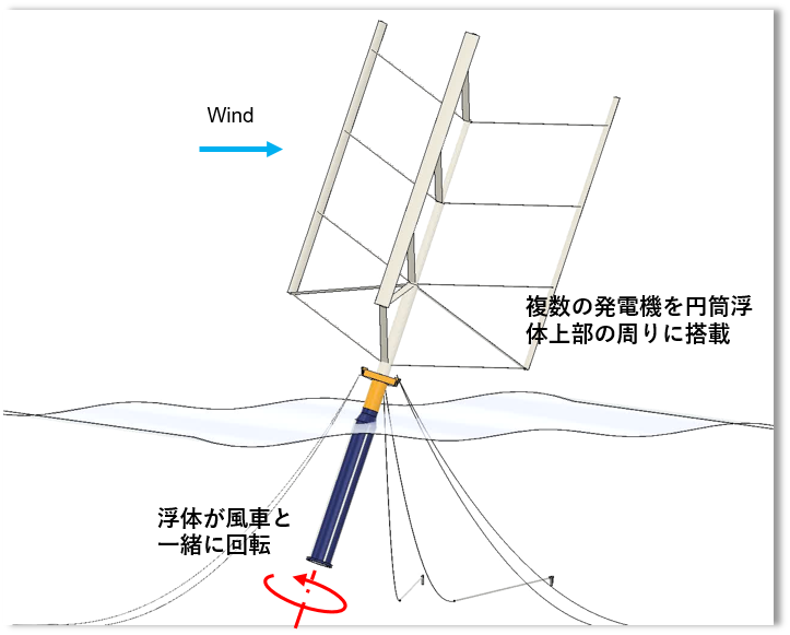 浮体式の洋上風車ですが、回転軸が直立する垂直軸型風車という形式です。円筒型の浮体と一緒に風車が回転するため、海水が軸受けとなります。これは風車の大型化に都合がよく、構造が単純であるため高い経済性が得られます。