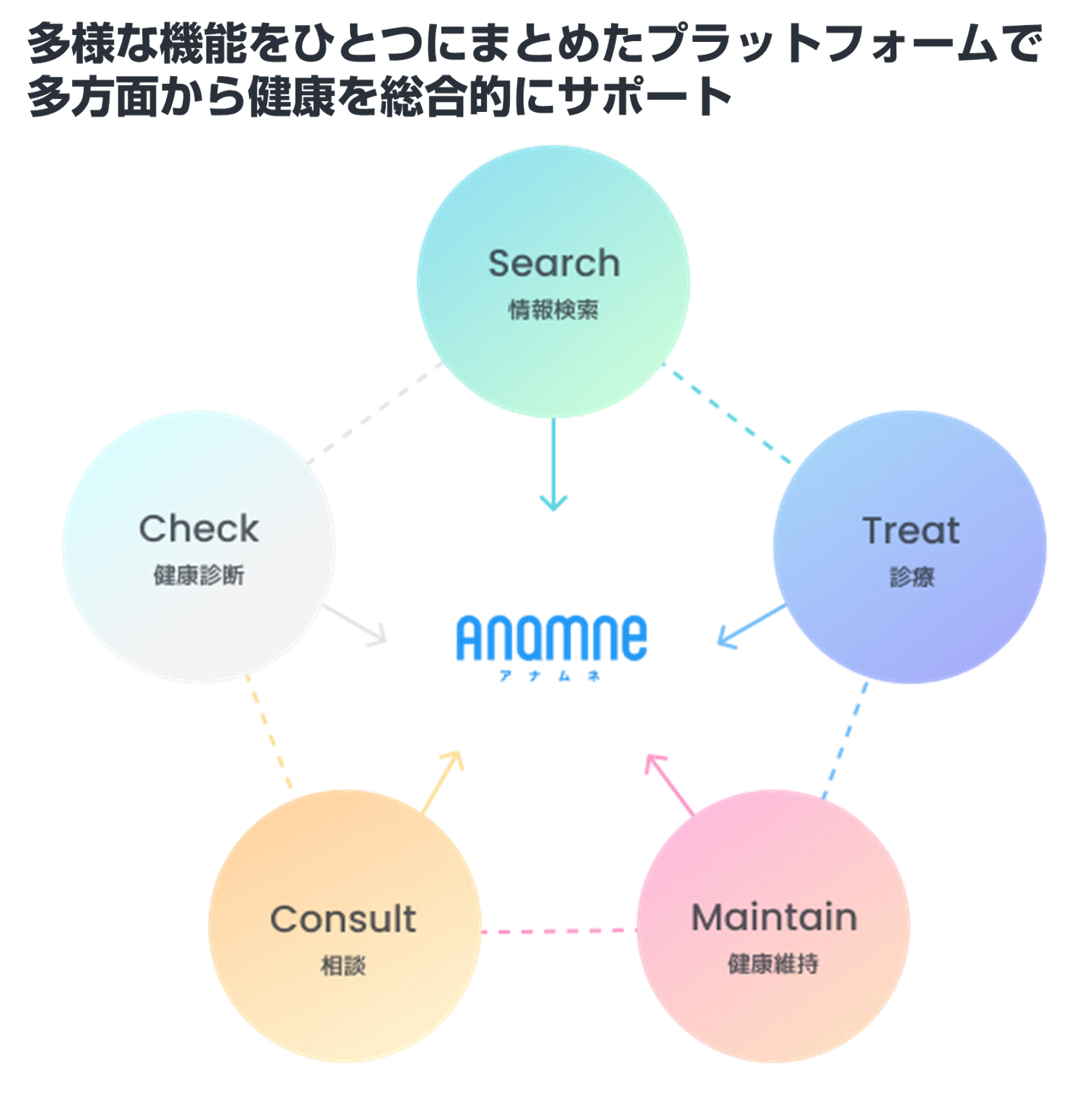 | 事業内容 | 「オンライン病院」の開発・運営 ●「Anamne オンライン医療相談サービス」の開発・運営 ●「Anamne オンライン診療プラットフォーム」の開発・運営 ●オンライン患者会プラットフォーム「clila (クリラ)」の開発・運営 健康経営支援クラウドサービス「Bloom( ブルーム) 」の開発・運営 |