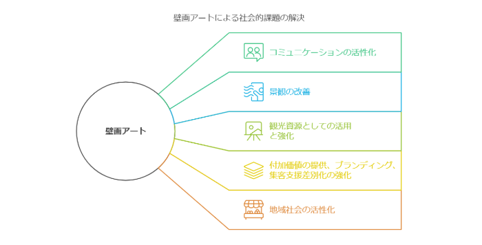 まず壁画アートがあることで周りの雰囲気が明るくなり、地域の活性化につながります。壁画アートが人々の会話のきっかけになり、お店や地域全体に親しみを持ってもらえるようになります。
