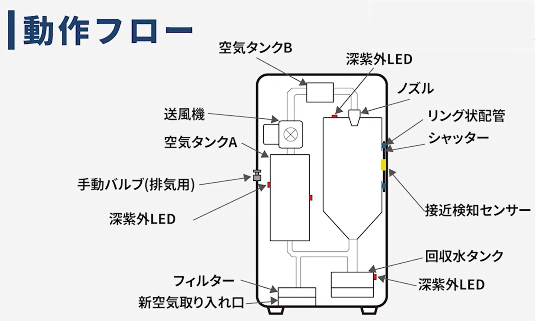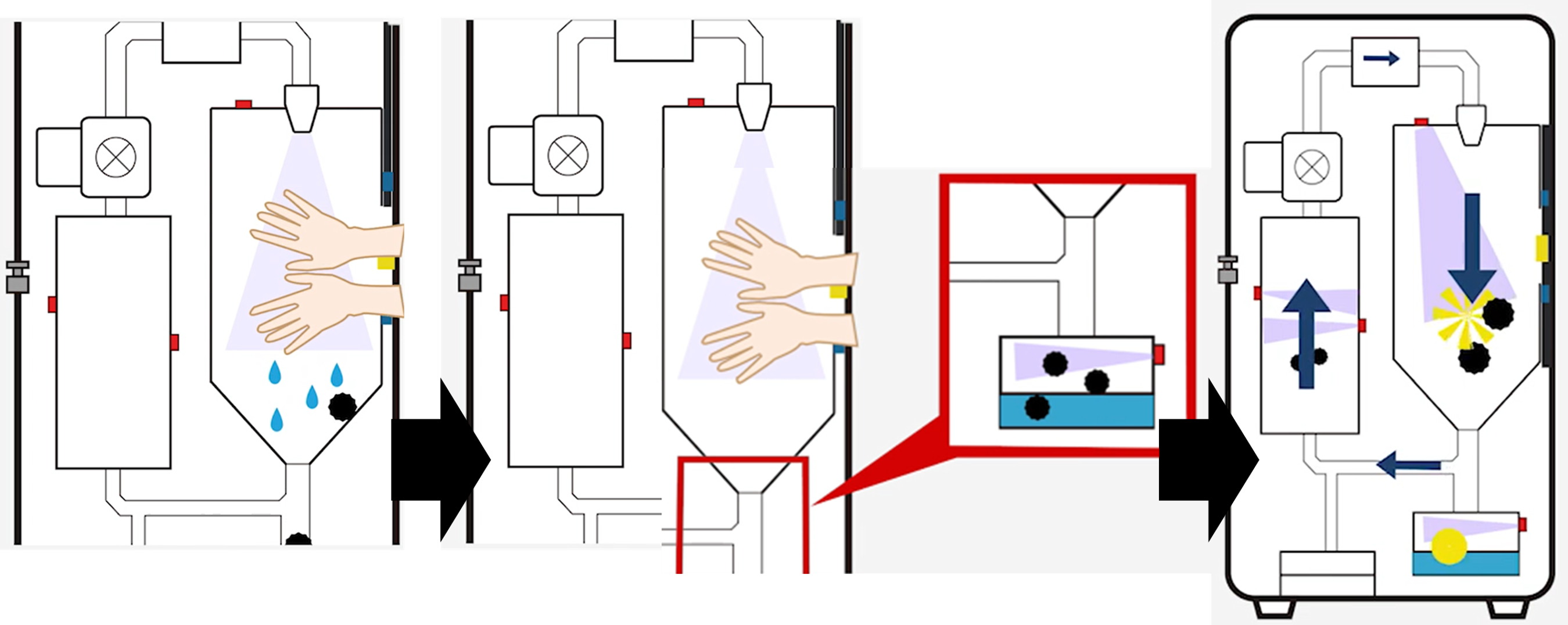 ①シャッター付きの手挿入空間内で、事前に空気タンク内に設けた深紫外LEDで殺菌されたクリーンな空気を手に吹き付けるため、清潔である。