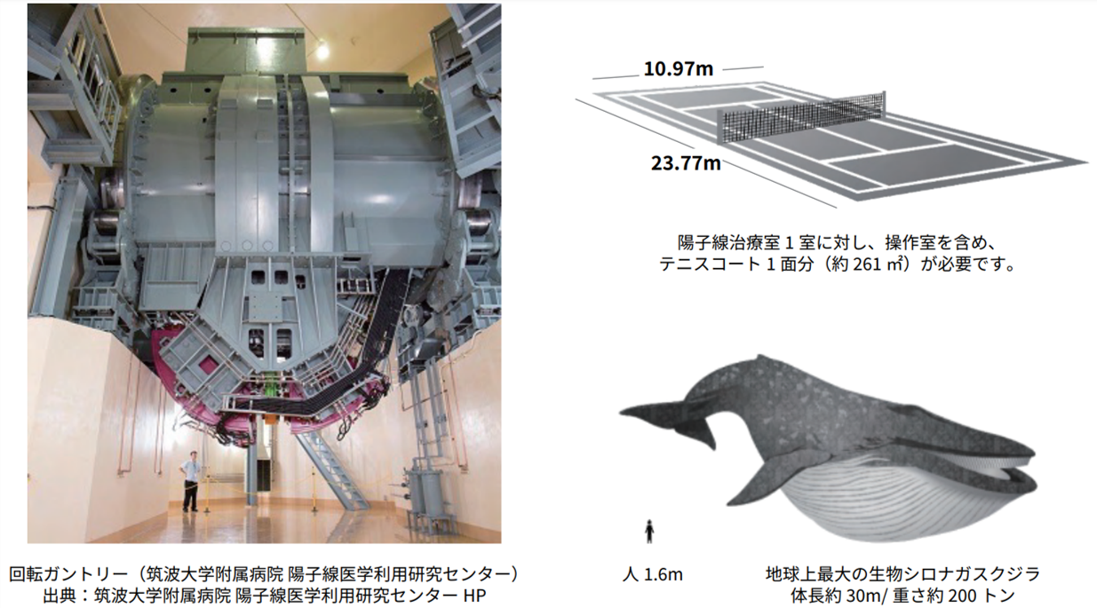 しかしながら、この陽子線治療を提供する病院は全国に19箇所しかなく、ごく一部の患者さましか受けられていないのが現状です。それは治療装置が高さ約10m、重さ約200tと巨大で、かつテニスコートほどのスペースが必要であること、そして費用として50億円以上が必要となるため、病院が導入するにはハードルが高い医療機器であることが大きな原因です。