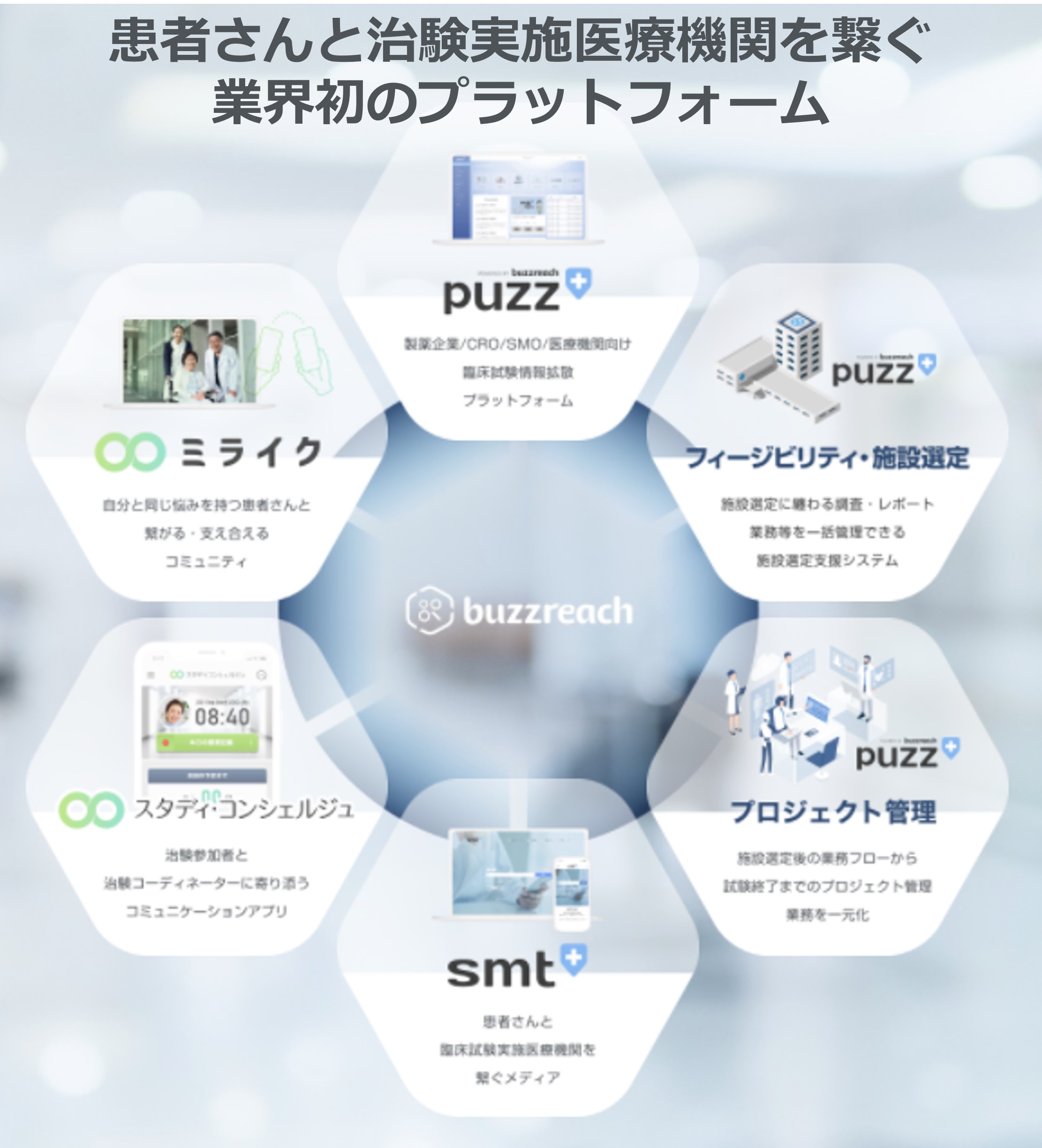 株式会社Buzzreachの事業の特長は、患者さんと治験実施医療機関を繋ぎ、関係各所に必要な情報を行き届かせ、より良い選択肢を最短経路で発見できる架け橋となる業界初のプラットフォーム(SaaS)を構築している、という点です。
