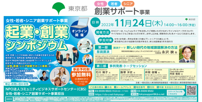 2022年11月1日 注目のニュース【11/24開催】東京都「女性・若者・シニア創業サポート事業」による『起業・創業シンポジウム』がオンラインにて開催