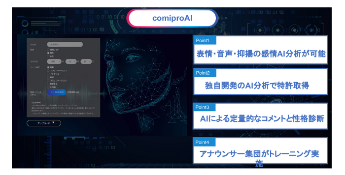 そんな『comiproAI』のトレーニングを、弊社ではアナウンサーが担当。アナウンサーと感情AI技術の融合によって、話し方や教育分野へのアプローチが様々な角度から可能であることも、『comiproAI』の強みであると感じています。