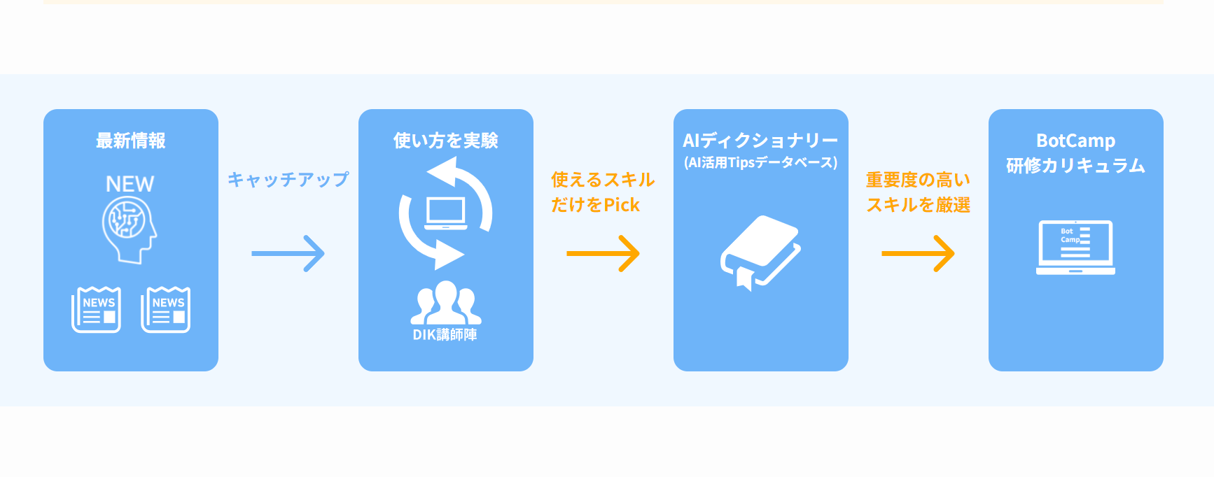 | サービス名 | 株式会社DIK&Companyは企業様向けに、「ExcelCamp」というExcelを活用したデータ分析人材育成の研修サービスを運営しています。 また、「BotCamp」というchatGPTを活用した業務の自動化/高度化についてのノウハウをお教えするカリキュラムも展開しています。 |