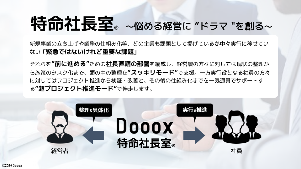 そんな中、Doooxは「特命社長室®」というユニークなサービスを通じて、企業や経営者のアイデアを具体化し、実行に移すための支援を行っています。また、「街盛プロジェクト」では、地域活性化を目指し、持続可能な事業を創出する取り組みを進めています。