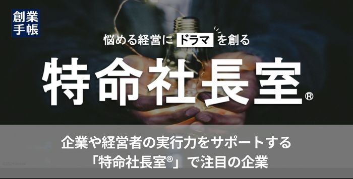 メイン事業である「特命社長室®」は、経営者の持つ漠然としたアイデアや課題を”前に進める”ために徹底的に具体化し、実行を推進していく”社外社長室”として伴走するサービスです。