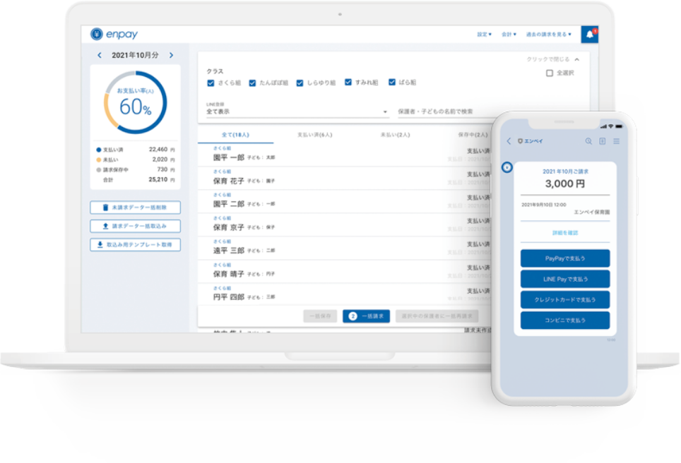 「エンペイ」は、パソコンとスマホを活用し、現金や紙を一切やり取りすることなく、請求からお支払いまでが完結する、集金業務支援サービスです。リアルタイムでの支払い状況の確認や消し込み作業など全て自動管理が可能です。また、集金業務だけでなく会計データを自動作成し、会計業務管理までワンストップで行えます。集金業務から会計業務まで、教育施設の圧倒的な業務負担軽減を実現いたします。