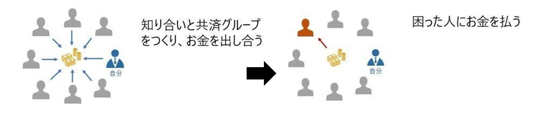 簡単に言うと、知り合い同士でネット上のコミュニティを作りあらかじめお金を出し合っておき、その中の誰かがアクシデントに遭ったらそのお金を支払う、という仕組みです。