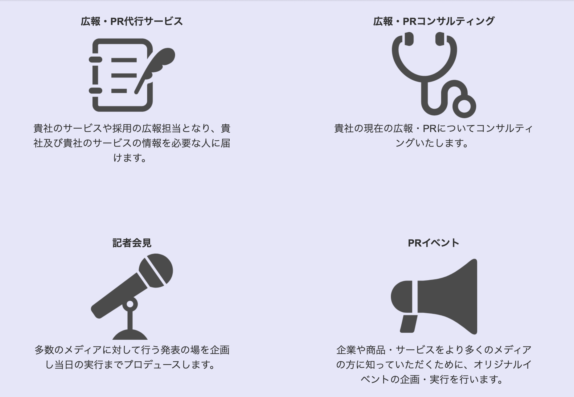 | サービス名 | 企業/商品の広報・PRサポート ・採用広報・PRサポート「採P(さいぴー)」 ・美容とライフスタイル発信に特化した広報・PRサポート「Beauty and Lifestyle PR」 |