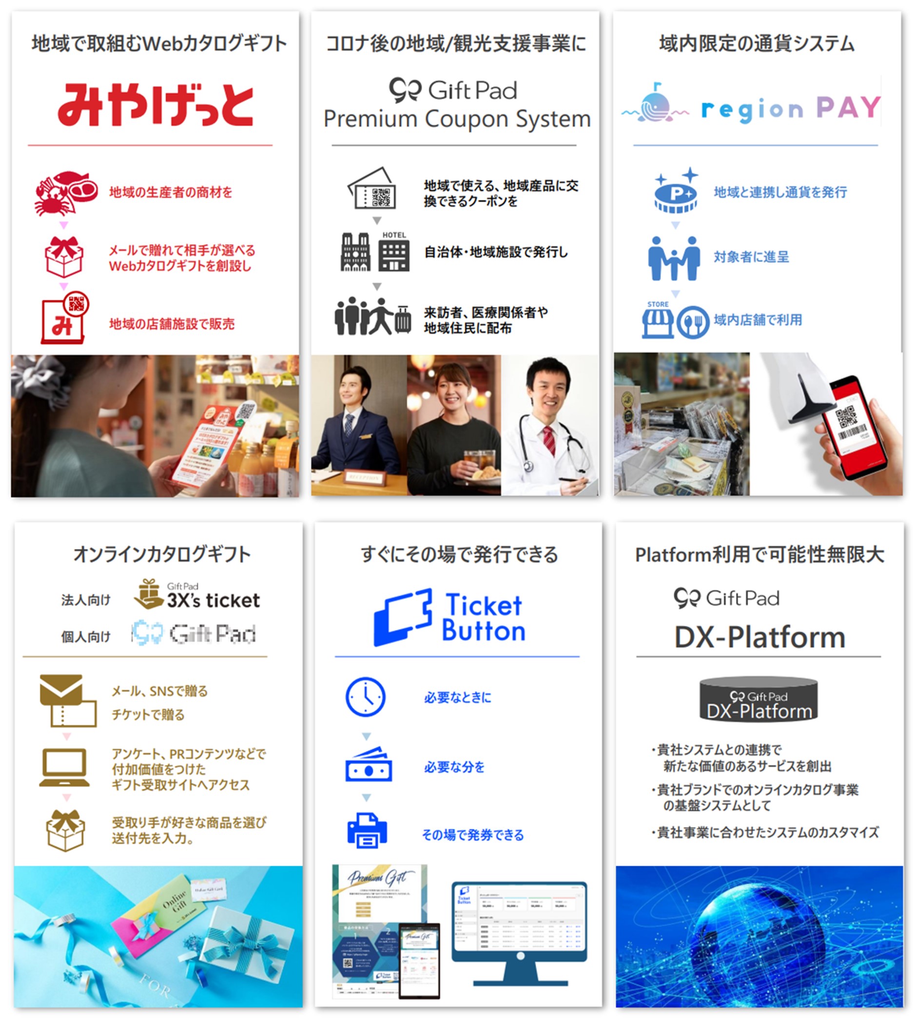 | サービス名 | 3X’s ticket、DX Platform、Ticket Button、Premium Coupon、みやげっと/シオクル、Gift Pad |