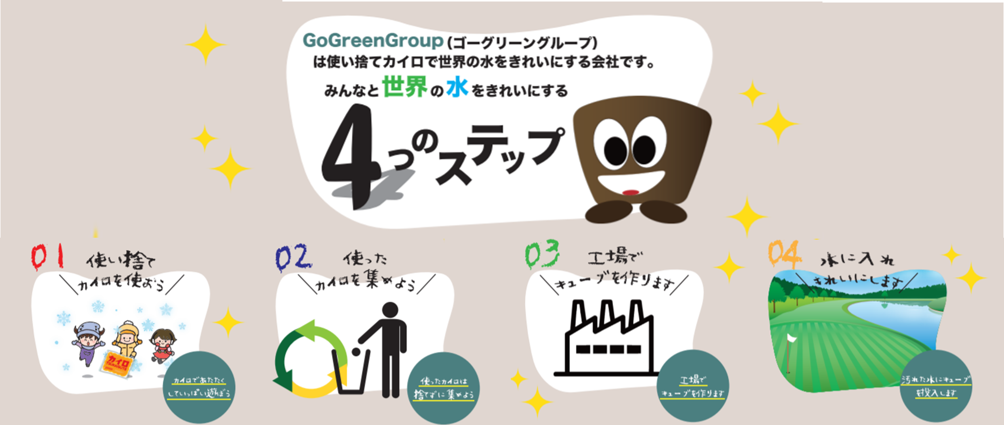 使用済み使い捨てカイロをリサイクルした『Go Green Cube』を汚れた水に投入するだけで水質改善が出来る、「手軽さ」「わかりやすさ」「環境への配慮」という点です。