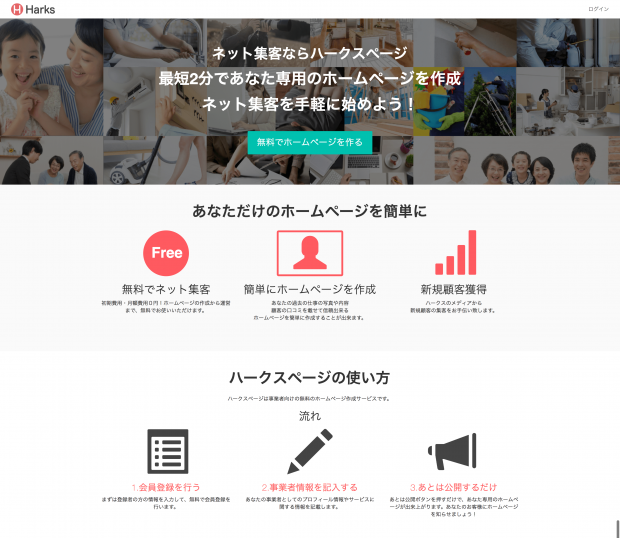 「ハークスページ」は無料でできるホームページ制作サービス。事業者がすぐにwebサイトを構築できるようにシンプルに作られており2分で構築できるのが売りだ。
