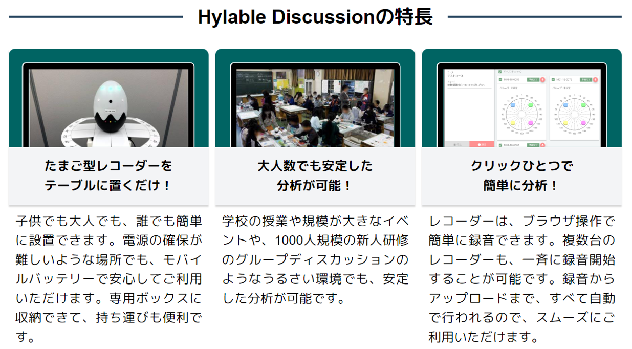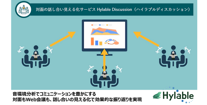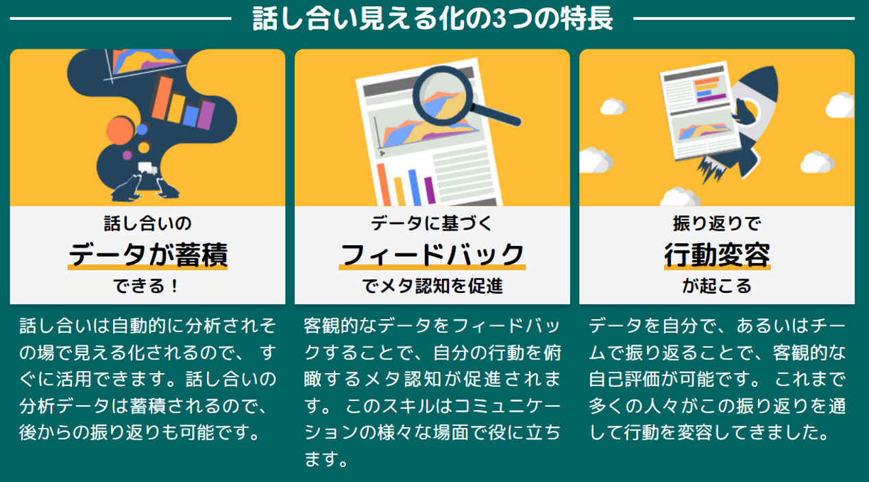 学校や企業の会議における話し合いをリアルタイムで定量的に可視化することができることが特徴です。