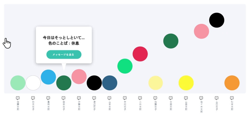 入力が終了すると、チームメンバーが思い思いに選んだ色の玉が並んで、色とりどりに弾む様子が見られます。弾む高さが高いほど気分が良いというメーターになっていて、メンバーの「今日のひと言」を読むことにより、チームメンバーの気持ちを察したり、状況を共有できるツールになっています。