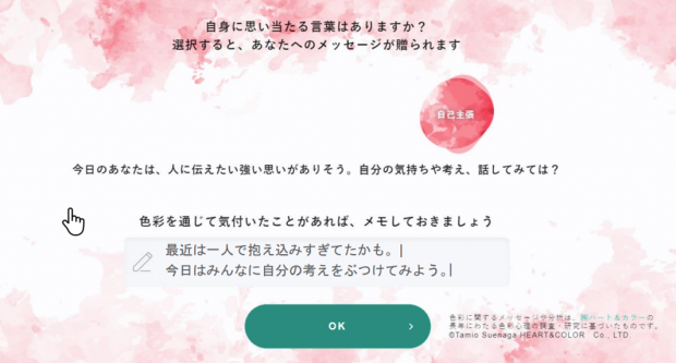 3ステップ目では、自分が選んだ色について、自動でフィードバックメッセージが送られるので、メッセージを読んで気づきがあればメモします。この機能では「潜在的な意識を言い当てられることもあり、思考の整理になる」との評価もいただいています。