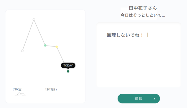 メンバーの気になるひと言にはメッセージ交換もできますが、あえて1日1往復までに制限しているので、気にかけているという想いがシンプルに伝わるようになっています。